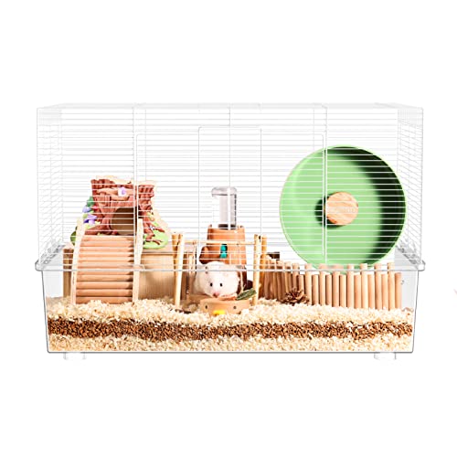 BUCATSTATEのハムスターケージは、620×350×430mmのサイズで、回し車や給水器、バスルームなど9点が揃ったオールインワンセットです。木目調デザインで小動物の飼育に最適です。
