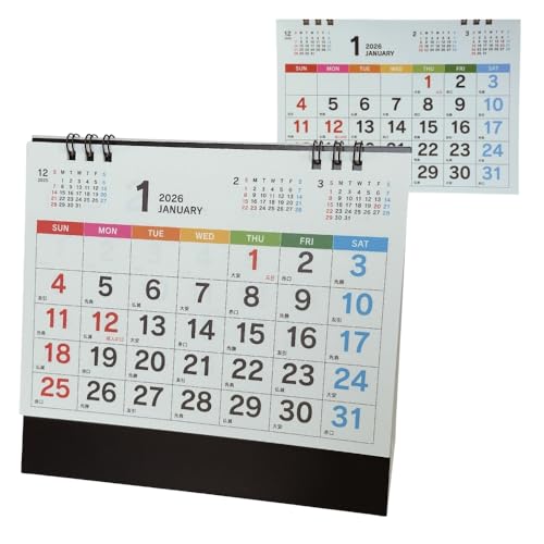 2026年1月始まりの卓上カレンダー。シンプルでコンパクトなデザイン、両面使用可能。サイズは156×170mm(組立時)。シックなブラックが、どんなデスクにも調和します。