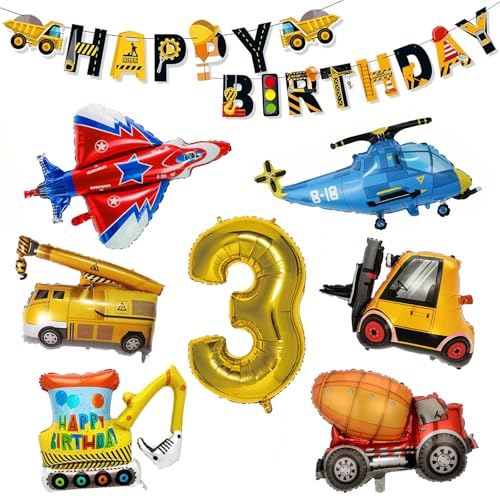 3歳男の子向けの乗り物テーマ誕生日飾り付けセット。ナンバー3付きのバルーン、工事現場車両や飛行機のデザイン。HAPPY BIRTHDAYガーランドも!