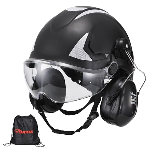 SAFEYEARプロフェッショナル防護ヘルメットは、スクラッチ防止ゴーグル、25dB防音イヤーマフ付き。CE EN397認証、反射ストライプ、通気孔、アゴストラップ、ABS素材で安心・快適な使用を実現。