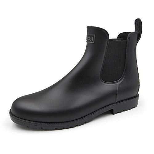 アモジのレインブーツは、メンズ・レディース兼用のショートチェルシーシューズ。防水でオフィスや通勤にも最適、スタイリッシュなデザイン。サイズ25.0cm、黒色。