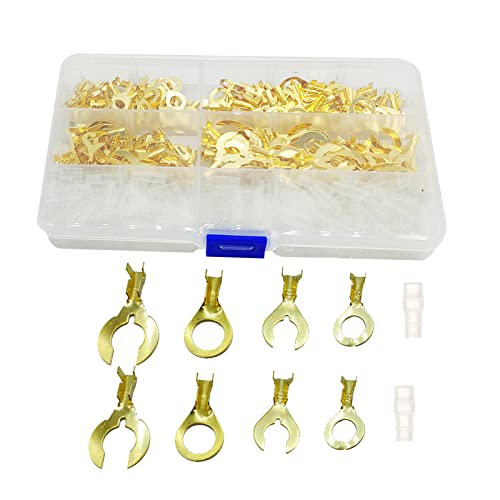 Φ6mmとΦ8mmの端子セット。C型、丸型、クワガタ端子を含む、真鍮製の裸圧着端子です。ギボシ端子やケーブルラグも含まれ、絶縁スリーブ付きで安全。収納ケース付きでDIYや配線に便利。