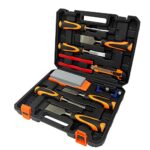 HFS(R) 木工用 DIY 道具セットには、ノコギリ、ハンマー、ドライバー、メジャー、鉛筆、クランプが含まれています。初心者に最適な製品で、様々な木工プロジェクトに対応。