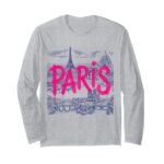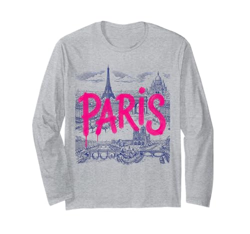 パリの美しい街並みを描いたイラストが特徴の長袖Tシャツ。柔らかなコットン素材で快適な着心地。印象的な太字のピンクペイントテキストがスタイリッシュさを引き立てます。エレガントなアイテムです。