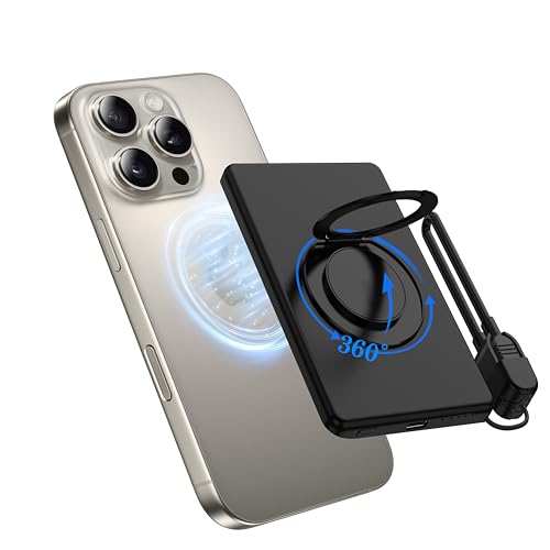 KWATUNGの超薄型モバイルバッテリー(5000mAh)は、MagSafe対応で、360°回転スタンド付き。PD20Wの急速充電や2台同時充電、LED残量表示あり。iPhone 12〜17シリーズ対応で、旅行や災害用に最適です。