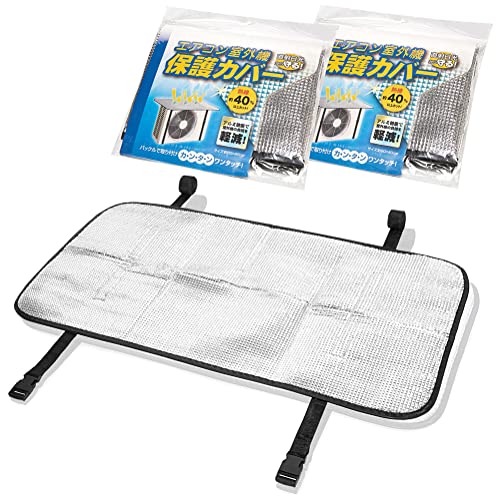 エアコン室外機カバーは、2枚セットで提供され、日よけや遮熱効果があります。ワンタッチ設計で簡単に取り付け、エアコン性能を向上させる製品です。
