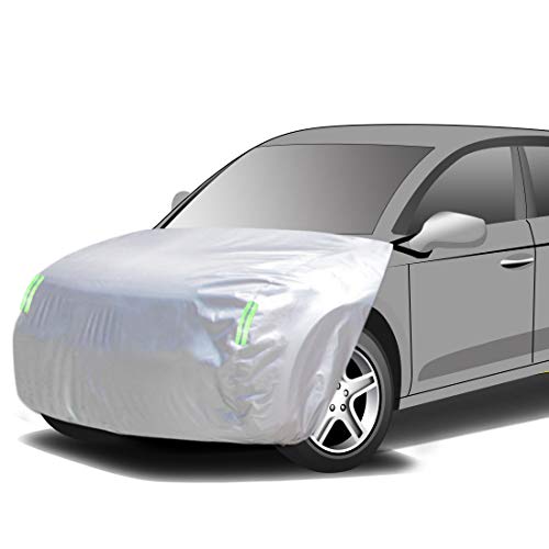 ボンネット保護カバーは、防炎フロントカバーで裏起毛タイプ。防塵効果と蛍光反射ストリップ付。ゴムバンドで長さ調整可能。対象はSUV・オフロード車(車長4.00m~5.20m、車幅1.65m~1.85m)。