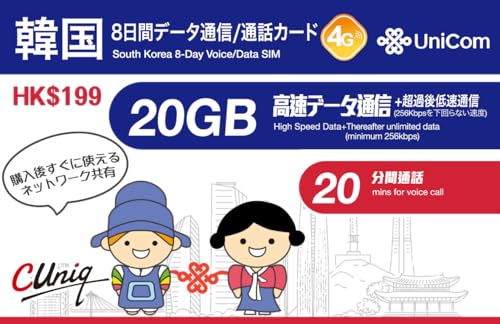韓国で8日間利用可能なデータ/音声通話SIMカードです。20GBのデータ通信が含まれており、中国聯通香港(China Unicom)が提供します。旅行中の通信に便利です。