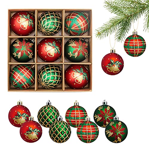 9ピースの60mmクリスマスボールオーナメント。赤と緑のデザインで、飛散防止機能付き。クリスマスツリーやパーティー、結婚式の装飾に最適です。