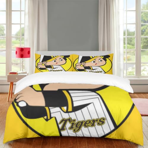 阪神タイガースの布団カバー3点セット。シングルサイズで洋式和式兼用。敷き布団カバー、シーツ、枕カバーが含まれ、洗えるデザイン。サイズは172x228cm。キャラクターグッズとして楽しめる寝具です。