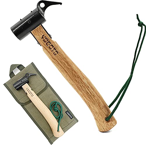 YOGOTOの第2世代ペグハンマーは木材製で、安全なデザインが特徴。ベルト付きで携帯しやすく、防水帆布ケース(オリーブ色)も付属しています。アウトドアでの使用に最適です。