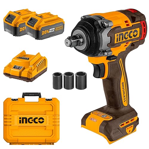 INGCO 20V ブラシレスインパクトレンチは、500Nmのトルクを持ち、コードレスで1/2インチの電動インパクトガンです。2200RPMの速度、2個の4.0Ahバッテリーと急速充電器付き。