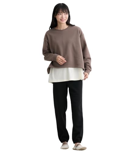 ニッセンのマタニティルームウェア・パジャマは、あったか裏起毛素材を使用した上下セットです。産前・産後対応で、レイヤードデザインの裾が特徴。サイズはマタニティMで、トープカラー。快適さを追求した一着です。