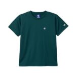 チャンピオンのキッズ用半袖Tシャツ。吸水速乾素材で快適な着心地。丸首デザイン、刺繍のワンポイントロゴが特徴。色はダークグリーン、サイズは120です。