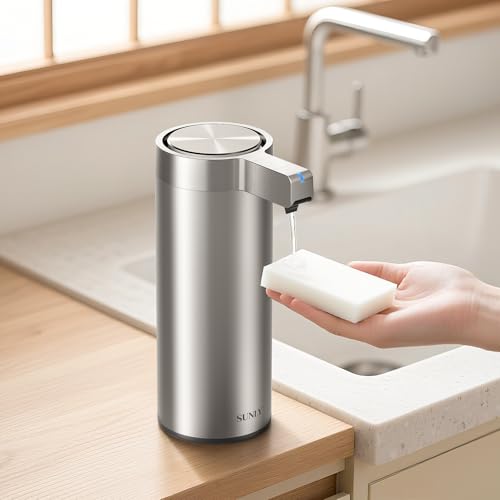 SUNLYの自動ソープディスペンサーは、液体洗剤や食器用洗剤に対応し、3段階の吐出量設定が可能です。高感度センサー搭載で、静音設計、IPX5防水、270mlの容量、USB充電式でスタイリッシュなステンレス製。キッチンや洗面所に最適です。