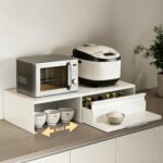 EastEamilyの収納ラックは2段で引き出し付き、幅47〜90cmに伸縮可能な電子レンジ台。スチール製で完成品、キッチン雑貨の収納やスペース活用に最適なホワイト色のデザインです。