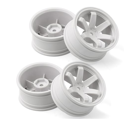 Chanmoo 1/10 RCラリーレーシングホイール。12mm六角ハードプラスチック製。オンロード用タイヤで、1:10スケールのドリフトカーに適合。TT01, TT02, XV01などに対応。ホワイトの4個セット。
