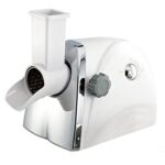 業務用電動チーズおろし器。3種のドラムブレード付きで、チーズ、キュウリ、ニンジン、ナッツを簡単にシュレッド。効率的な調理をサポート!