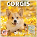 2026年のコーギー壁掛けカレンダー。100枚以上のリマインダーステッカー付き。サイズは12インチ x 24インチ、ギフトにも最適な米国製です。