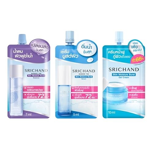 SRICHANDのトラベルセットは、スキンモイスチャーバーストシリーズの保湿エッセンス、美容液、保湿ジェルクリームの3点が含まれています。敏感肌にも優しく、旅行やお泊まり先でも使いやすいパウチタイプです。