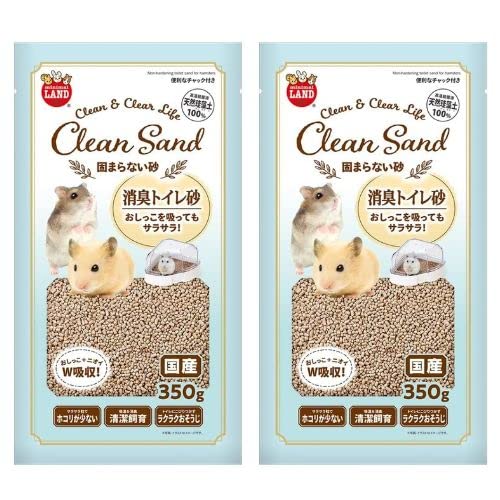 マルカン固まらない砂は、350g入りが2袋セットです。優れた吸水性と消臭効果を持ち、水を含んでも固まらない珪藻土を使用しています。ハムスター用トイレ砂に最適です。
