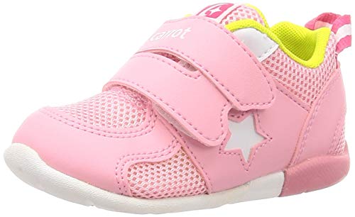 キャロットのベビーシューズは、幅広3Eで12~14.5cmのサイズ展開。男の子および女の子向けのデザインで、ピンク色の14.0cmサイズがあります。快適な履き心地で成長する足に対応。