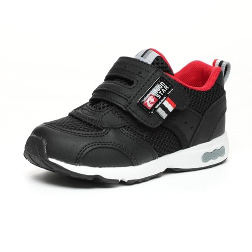 キャロットのスニーカーは、幅広3E仕様で14~21cmのサイズ展開。男の子・女の子向けで、ブラック/レッドのデザインが魅力。特に18.5cmサイズは、快適な履き心地が特徴です。