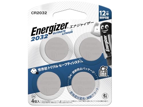 エナジャイザー CR2032は、12年保存可能なリチウムコイン電池。誤飲防止パッケージと苦味成分塗布で安全性を確保。時計や家電、電子機器に最適な4個パックです。