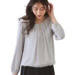 ニッセンの長袖シフォンブラウスは、タックデザインで洗練された印象。裏地付きで秋冬のオフィスや通勤に最適。春秋に使えるグレーのMサイズ。着心地も良く、ビジネスシーンにぴったり。
