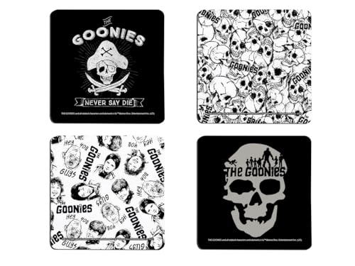 『ザ・グーニーズ』の3.5インチハードボードコースター4枚セット。公式ライセンスのコレクターアイテムで、ギフトにも最適です!