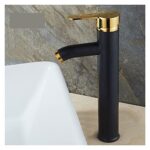 高級バスルーム用の黒いシングルハンドル水ミキサータップ。ホット&コールドスイッチ搭載で、洗面台やデッキマウントに最適。カラー:ブラックゴールド、スタイリッシュなデザインでキッチンやバスルームにマッチ。