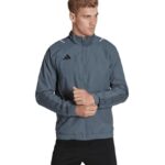 adidas TIRO23 C プレゼンテーションジャケットは、サッカー用のウィンドブレーカーシャツで、軽量で動きやすいデザイン。色はオニックス、サイズはJ/L。通気性に優れ、練習や試合前のウォーミングアップに最適です。