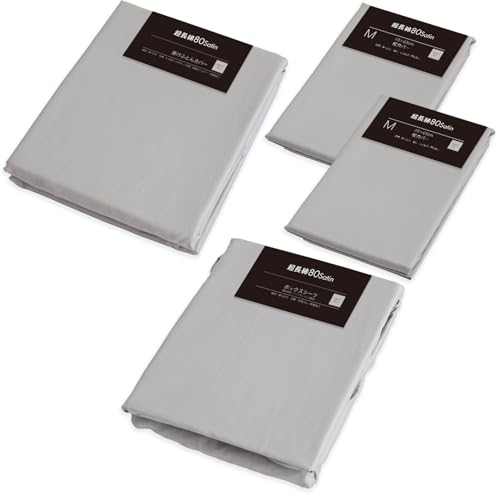 ふとんの江崎の超長綿100%使用の80サテン布団カバー4点セット。クイーン用のシルバーグレーで、掛け布団カバー、ボックスシーツ、枕カバーが含まれています。シンプルな無地デザインが魅力です。