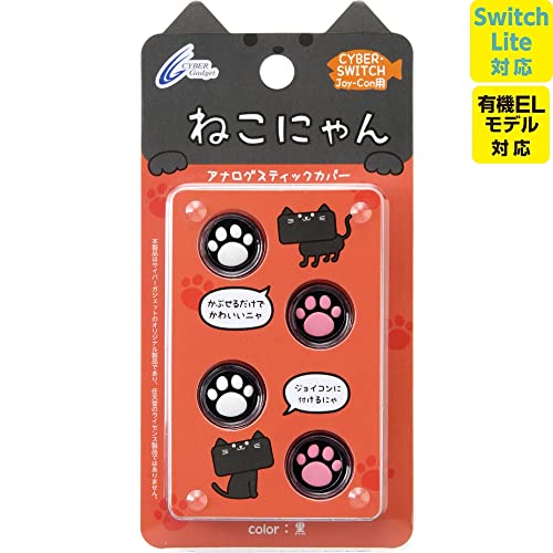 CYBER アナログスティックカバー ねこにゃんは、SWITCH Joy-Con用の黒色アクセサリーです。スティックの保護と滑り止め効果があり、かわいい猫デザインでプレイを楽しくします。