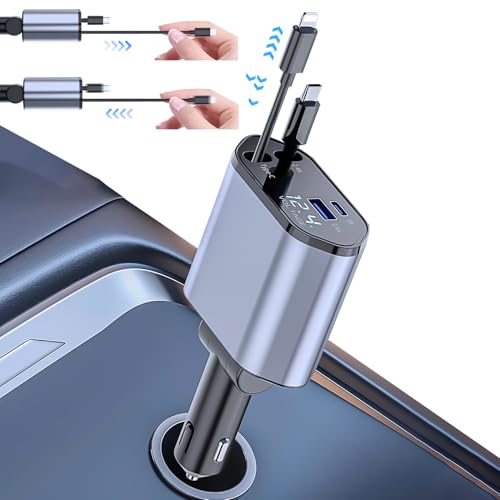 2025新設計の車用充電器。4in1機能で4台同時充電可能。巻き取り式充電ケーブル2本付き。Type-C100W、Lightning 20W急速充電対応。LED付きでオー電圧測定機能もあり、DC12/24V車対応。