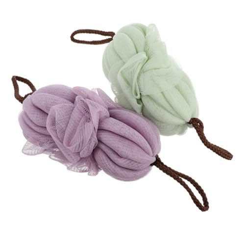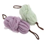 EXQUIMEUBLEの背中洗えるボディスポンジ2個セット。豊富な泡立ちのメッシュ素材で、バスやシャワーに最適。角質ケアもでき、便利な吊り下げストラップ付き。色はランダムでお届け。