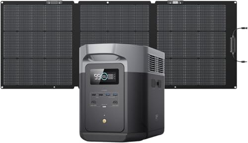 EcoFlowのDELTA 2 Maxは2048Whの大容量ポータブル電源で、2000W定格出力(瞬間最大2400W)を誇ります。160Wソーラーパネル2点付きで高変換効率、キャンプや防災に最適です。