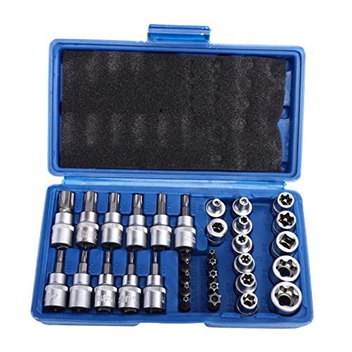 jojofunyのトルクス星型ドライバービット34個セットには、金属製外部ソケットと金属トルクスソケットが含まれ、自動車整備メンテナンスに最適です。ケース付きで持ち運びも便利です。