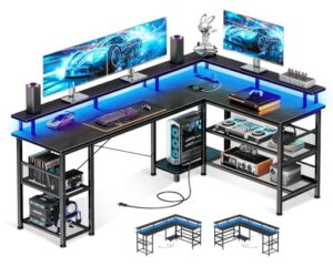 AODK ゲーミングデスク パソコンデスク コンセント付き l字デスク 机 pcデスク LEDライト付き 勉強机 棚付き オフィスデスク 幅150 ワークデスク 桌子 在宅勤務 事務机 組立簡単 ブラック