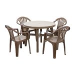 ガーデンチェアとガーデンテーブルの5点セット。ポリプロピレン製で軽量、持ち運びも簡単。アウトドアやキャンプに最適なガーデンファニチャー。色はブラウン。
