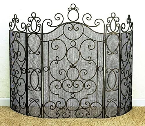 アンティーク真鍮仕上げの暖炉スクリーンガード。5パネル構造で58インチの幅を持ち、フラットデザインで安全性と美しさを兼ね備えています。大型暖炉にも最適。