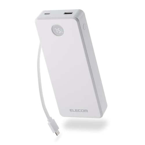 エレコムのモバイルバッテリーは67W出力、20000mAhの大容量。USB-Cケーブルが一体化され、リチウムイオン電池を採用。2ポートで同時充電可能なホワイトモデルです。