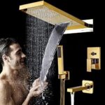 AJYBYUKJのラグジュアリーゴールデン壁取り付け式シャワー蛇口セットは、レインフォールとウォーターフォール機能を備えたABS製ミキサータップです。ハンドシャワーと浴槽スパウトが付き、ビューティーカムの設計が特徴です。