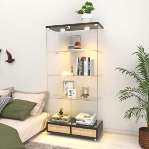 ガラスケース ショーケース【13色調光・LED照明】5mm防爆・耐火・強化ガラス|可動式 4段 収納棚 引き出し付き・鍵付き|ガラスキャビネット フィギュアケース 両開きドア コレクションケース ベージュ