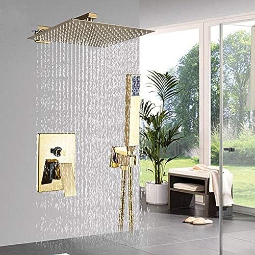 ゴールデンシャワー蛇口セットは、ラグジュアリーなデザインで10インチのレインフォールシャワー、壁マウントでスクエア型。ハンドシャワー付きで、美しいインストールが可能です。