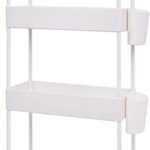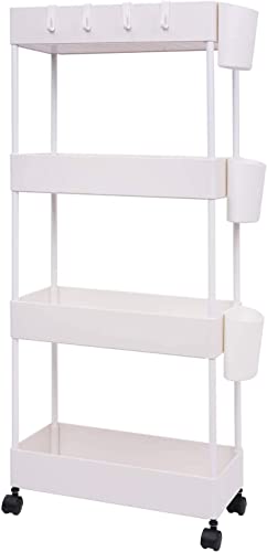 隙間収納キッチンワゴンは4段、幅18cmのスリムタイプ。キャスター付きで移動が簡単。洗面所やランドリーにも最適。木製で冷蔵庫横や浴室収納にぴったり。フック4つ、バスケット3つ付き、白いデザイン。