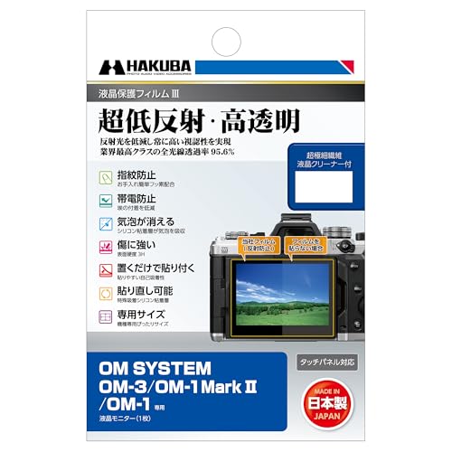 ハクバのデジタルカメラ液晶保護フィルムIIIは、OM SYSTEM OM-3/OM-1 MarkⅡ/OM-1専用で、全光線透過率95.6%の日本製です。画面をしっかり保護します。