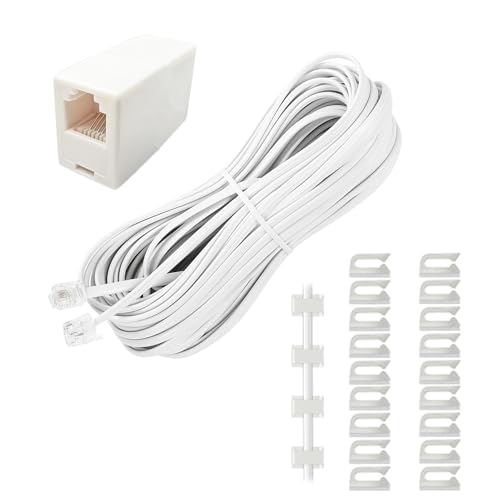 電話線モジュラーケーブル5m。6極4芯RJ11仕様で、オステレホンやファクシミリ、モデムに対応。軽量で爪折れ防止、ケーブルクリップ10個、インラインカプラー1個付き。剥がしても跡が残らないホワイトカラー。