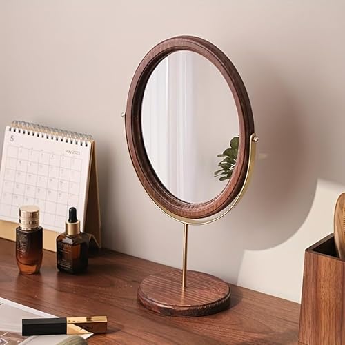 エレガントな木製バニティミラー。360°回転可能なヴィンテージ風デザインで、寮やホームデコに最適。シンプルなラグジュアリー感を演出するウォールナット色とゴールドフレームの組み合わせ。