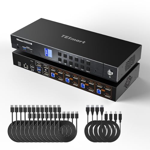 TESmartのDisplayPort KVMスイッチは、8K@60Hz対応で4入力3出力。4K@144Hzのデュアルモニター切替器、USB3.0、EDID対応、ギガビットネットワーク、リモコン操作可能。